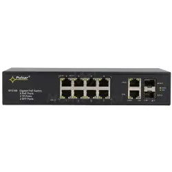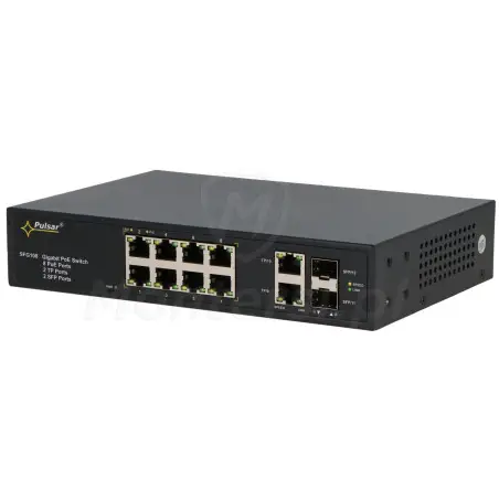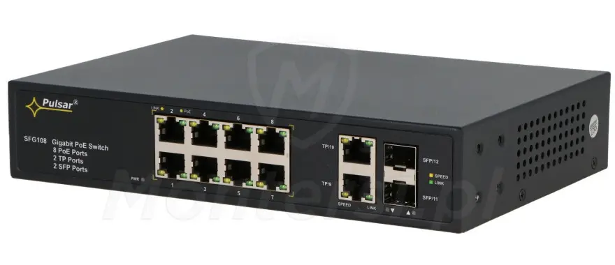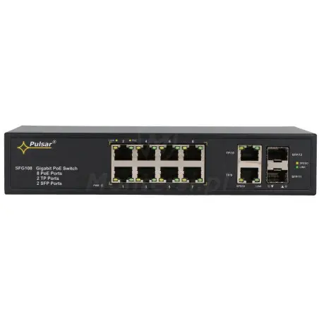 SFG108 - 12-portowy switch PoE dedykowany do pracy w systemie monitoringu IP. Niezawodny i prosty w obsłudze, umożliwia realizację zasilania i transmisji danych z maksymalnie 8 kamer PoE.