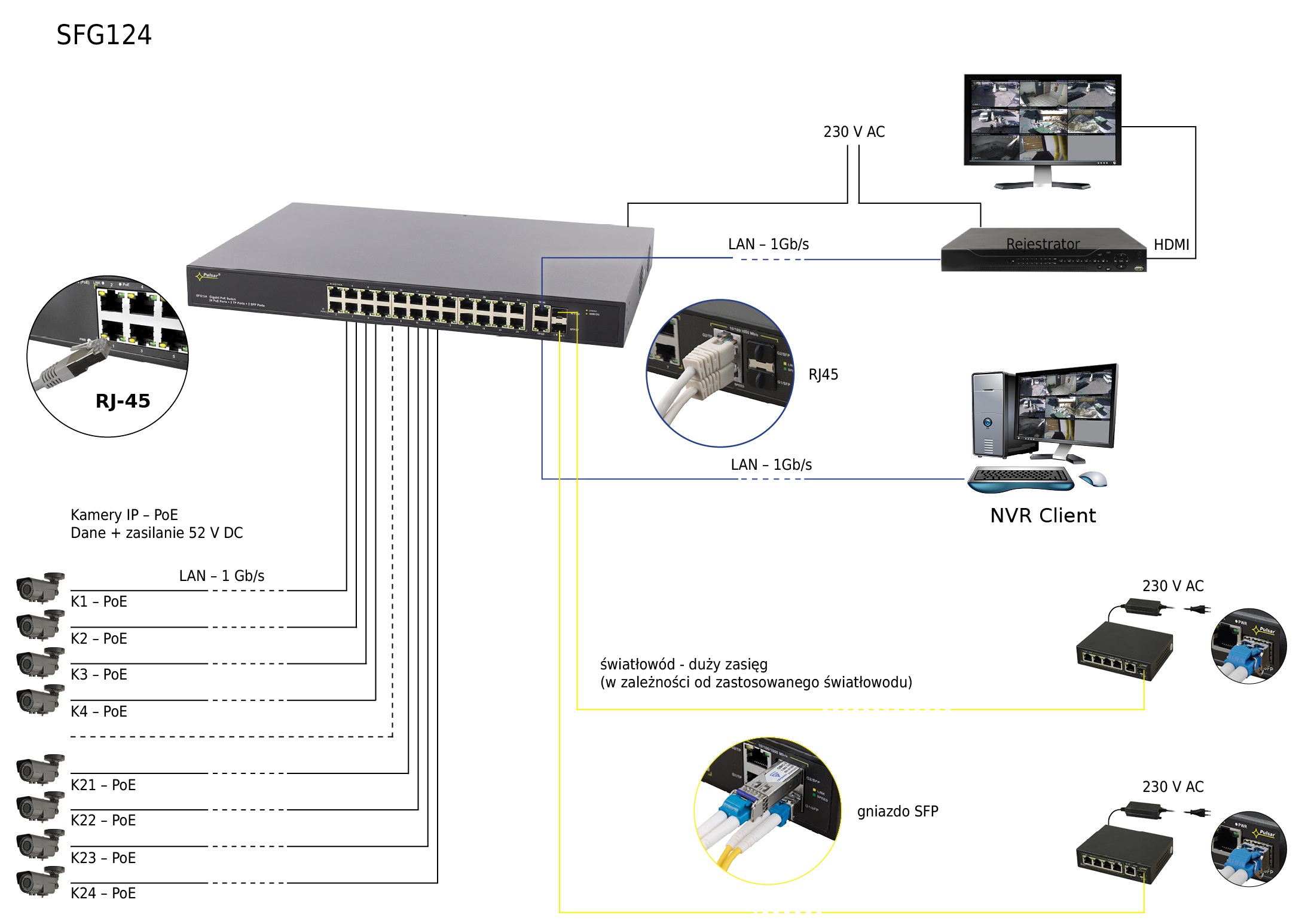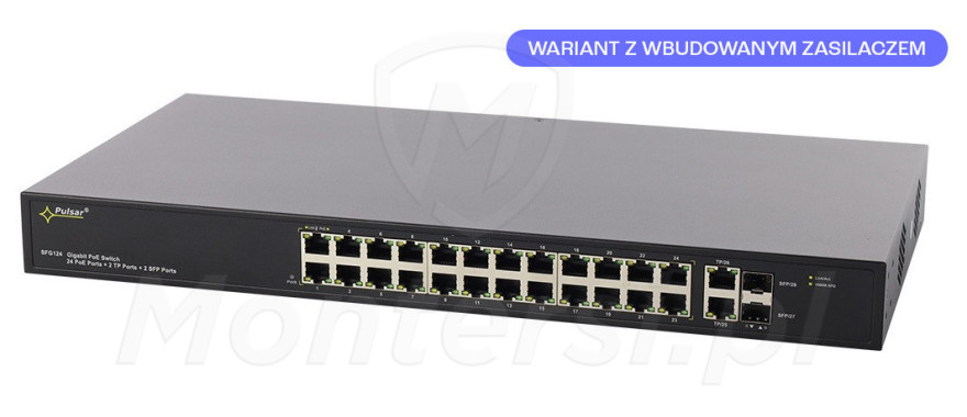 SFG124 - 28-portowy switch PoE dedykowany do pracy w systemie monitoringu IP. Niezawodny i prosty w obsłudze, umożliwia realizację zasilania i transmisji danych z maksymalnie 24 kamer PoE.