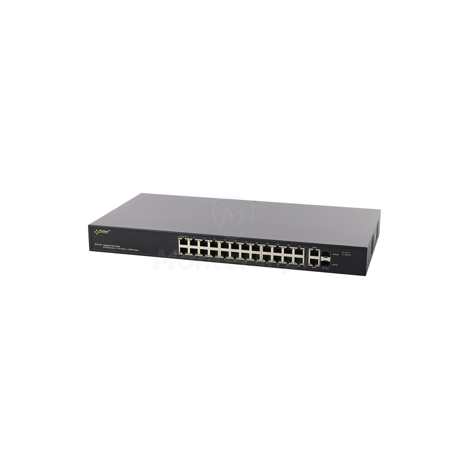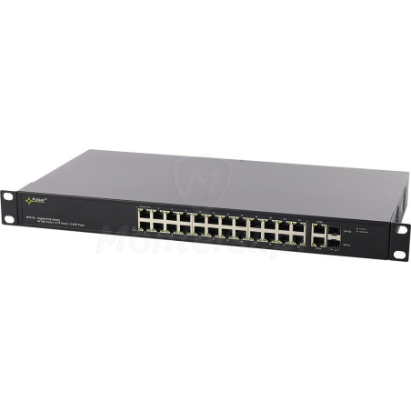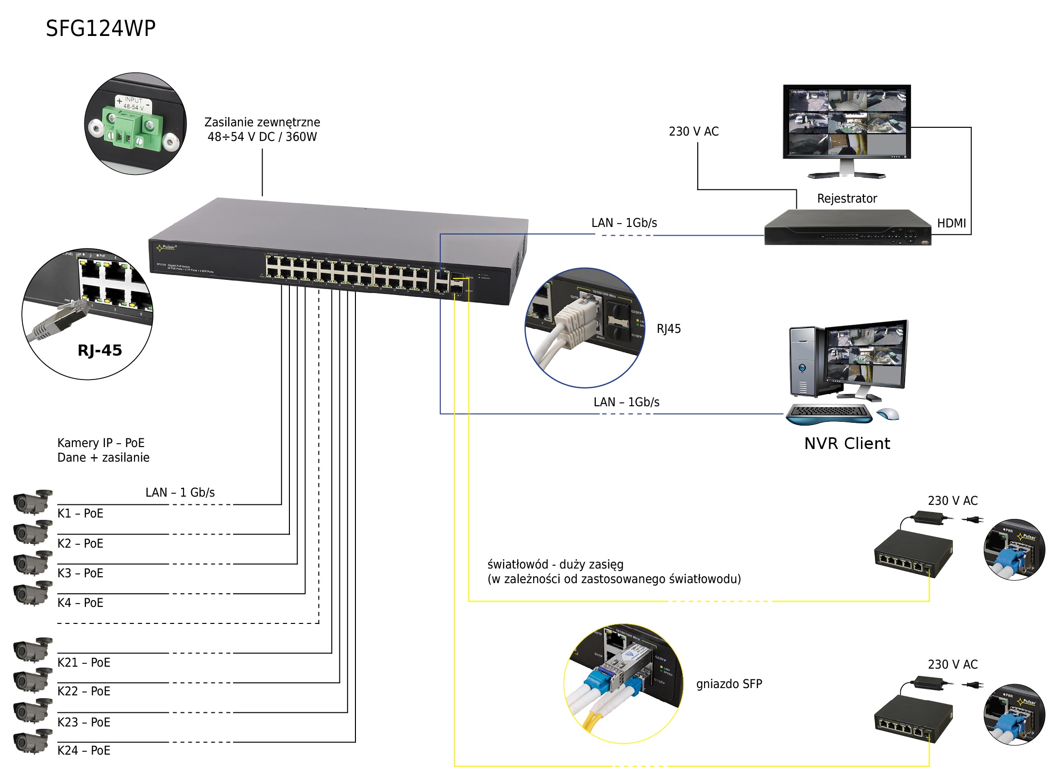 - Wbudowane 24 porty PoE 802.3af / 802.3at gigabit ethernet, do podłączenia kamer