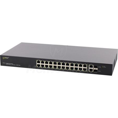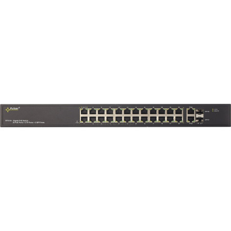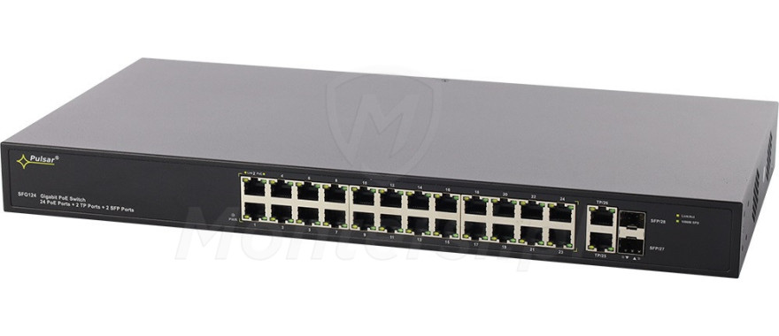 SFG124WP - 28-portowy switch PoE dedykowany do pracy w systemie monitoringu IP. Niezawodny i prosty w obsłudze, umożliwia realizację zasilania i transmisji danych z maksymalnie 24 kamer PoE.