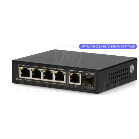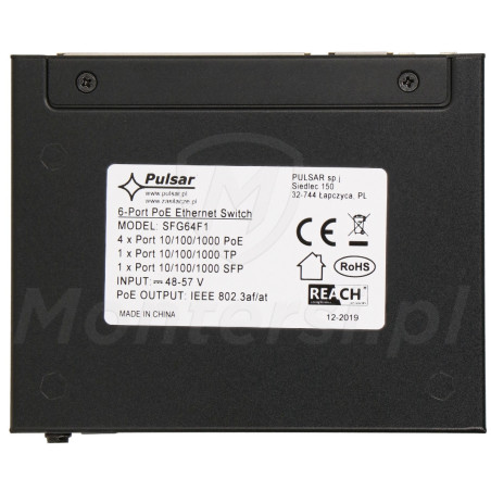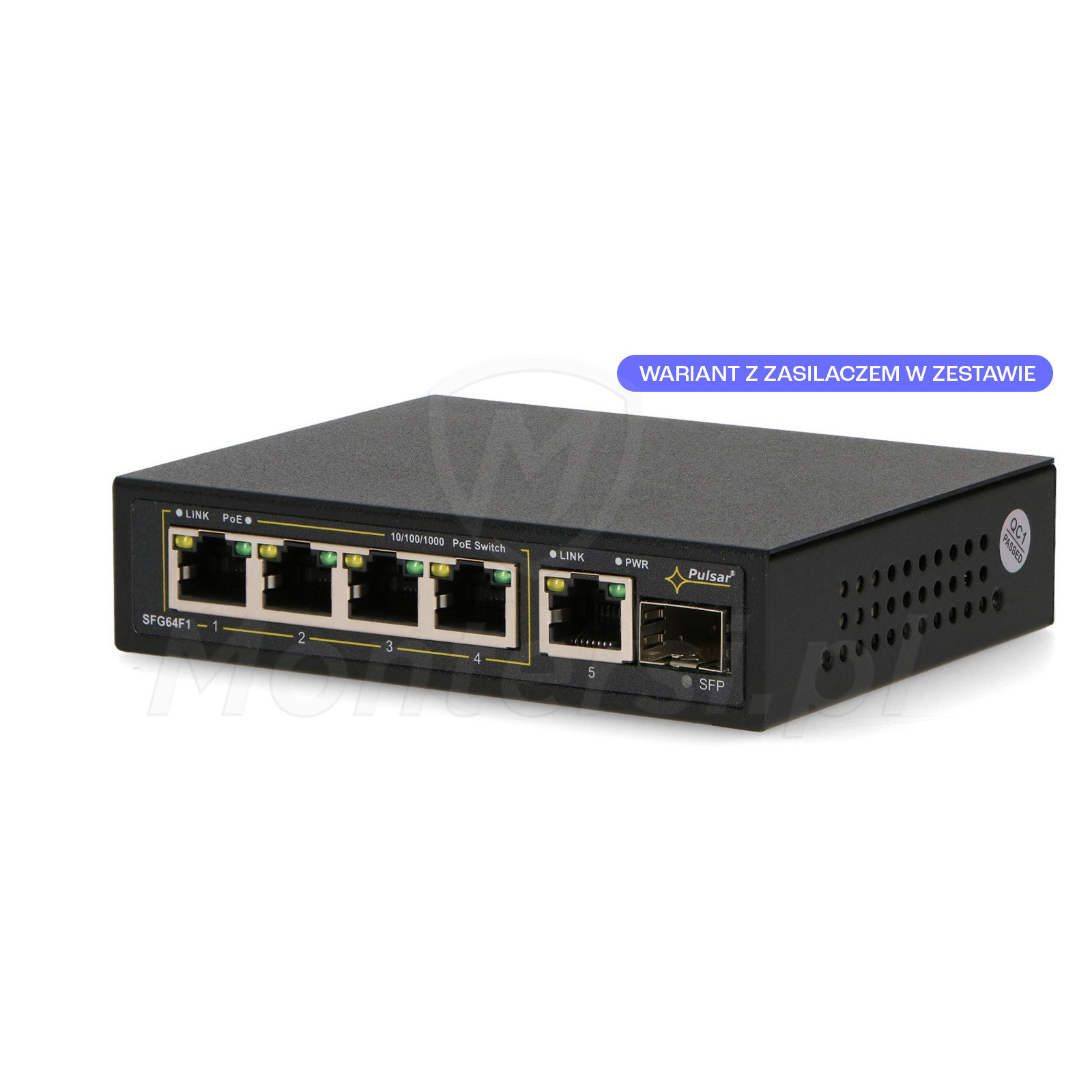 SFG64F1 - 6-portowy switch PoE dedykowany do pracy w systemie monitoringu IP. Niezawodny i prosty w obsłudze, umożliwia realizację zasilania i transmisji danych z maksymalnie 4 kamer PoE.