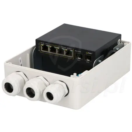 SFG64H - 6-portowy switch PoE dedykowany do pracy w systemie monitoringu IP. Może zasilać do 4 kamer IP jednocześnie dzięki technologii PoE. Urządzenie zamknięto w hermetycznej obudowie o klasie szczelności IP56. Niezawodny i prosty w obsłudze, umożliwia realizację zasilania i transmisji danych z maksymalnie 4 kamer PoE.
