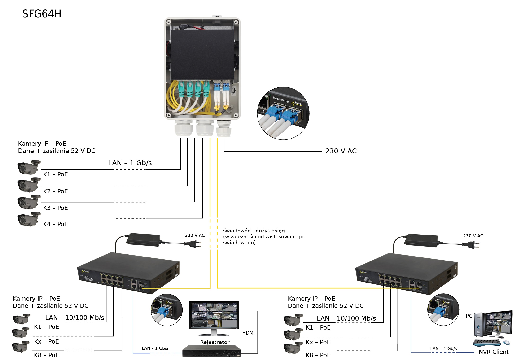 Switch Pulsar SFG64H sprawdza się świetnie w małych i średnich systemach monitoringu IP. Można go z powodzeniem stosować w miejscach takich jak np. domy, mieszkania, sklepy lub pomieszczenia biurowe. Ze względu na wysoką przepustowość na portach PoE / UPLINK, może skutecznie współpracować z kamerami wysokiej rozdzielczości oraz innymi switchami oferującymi łączność światłowodową.