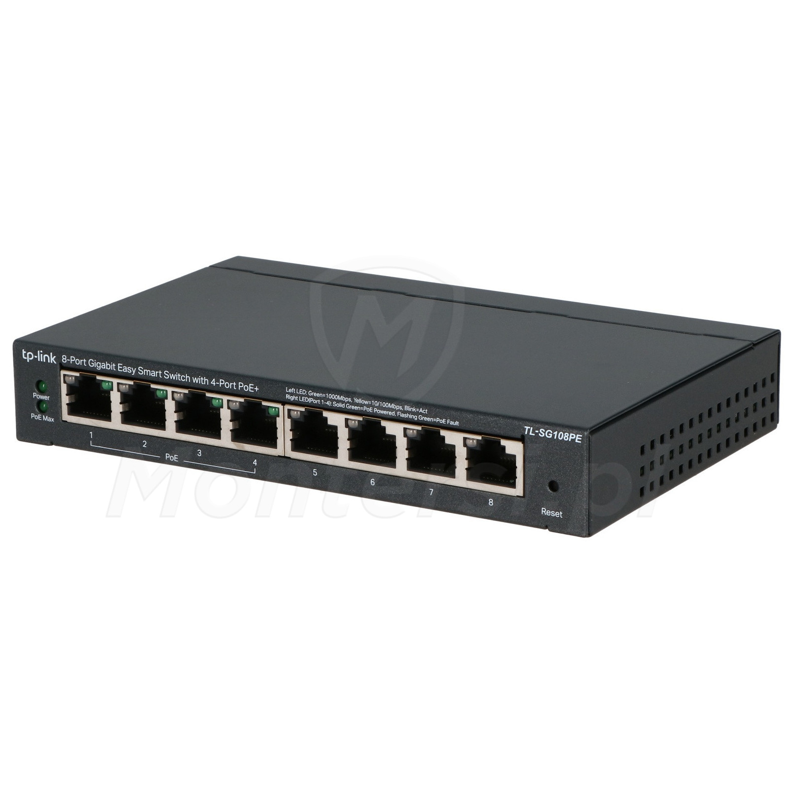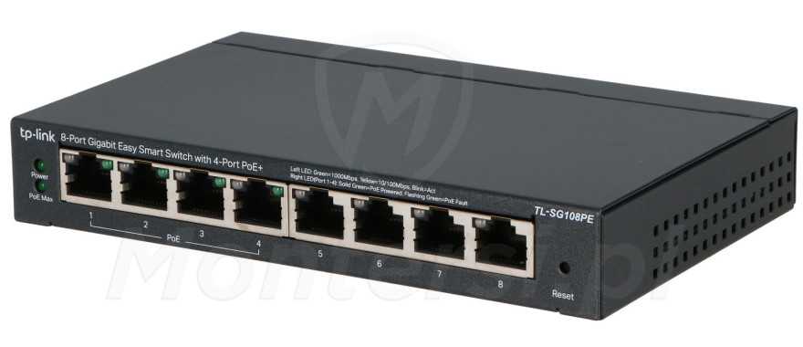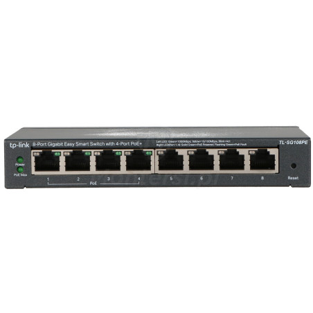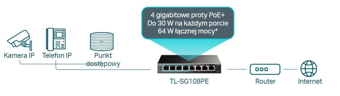 Model TL-SG108PE posiada wbudowane 4 porty PoE w standardzie 802.3af i 802.3at (PoE / PoE+). Służą one zarówno do transmisji danych i zasilania podłączonych kamer PoE, po tym samym kablu UTP.