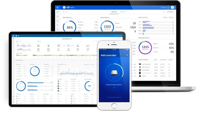 Dużą zaletą AP Ubiquity jest możliwość obsługi przy pomocy oprogramowania na komputer UniFi Controller. Z jego poziomu administrator systemu może w łatwy i szybki sposób przeprowadzić konfigurację Access Pointa lub całej sieci Wi-Fi. Dzięki intuicyjnemu interfejsowi użytkownika może również w prosty sposób zarządzać wszystkimi urządzeniami UAP w systemie i śledzić statystyki o wydajności sieci - ruch sieciowy jest wizualizowany przy pomocy łatwych do odczytu wykresów.