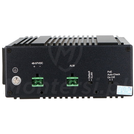Switch posiada złącza pozwalające na podłączenie do niego zasilacza sieciowego oraz zasilacza PoE (port Ethernet , max 60 W), zapewniając niezawodną pracę oraz zasilanie urządzeń podłączonych do switcha.
