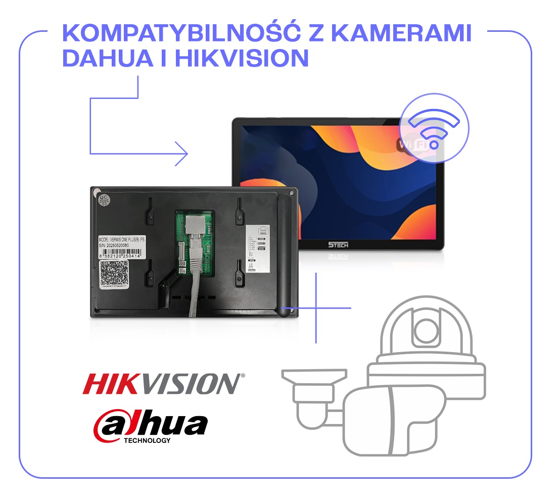 Łączność i integracja z systemami IPPrzewodowa lub bezprzewodowa komunikacja i obsługa kamer IPSeria Vermis oferuje elastyczne opcje połączenia z siecią – zarówno bezprzewodowo przez Wi-Fi, jak i przewodowo za pomocą skrętki CAT5/CAT6, z możliwością wykorzystania switchy POE do zasilania i transmisji danych. Urządzenie działa w standardzie IP, co pozwala na integrację z kamerami sieciowymi o rozdzielczości do 2 Mpx, w tym kompatybilnymi modelami od Hikvision oraz Dahua. Kamery muszą pracować w tej samej sieci lokalnej, a ich konfiguracja odbywa się poprzez przypisanie odpowiednich adresów IP. System wspiera także komunikację między monitorami tej samej serii, co umożliwia tworzenie rozbudowanych instalacji z wieloma punktami dostępu.