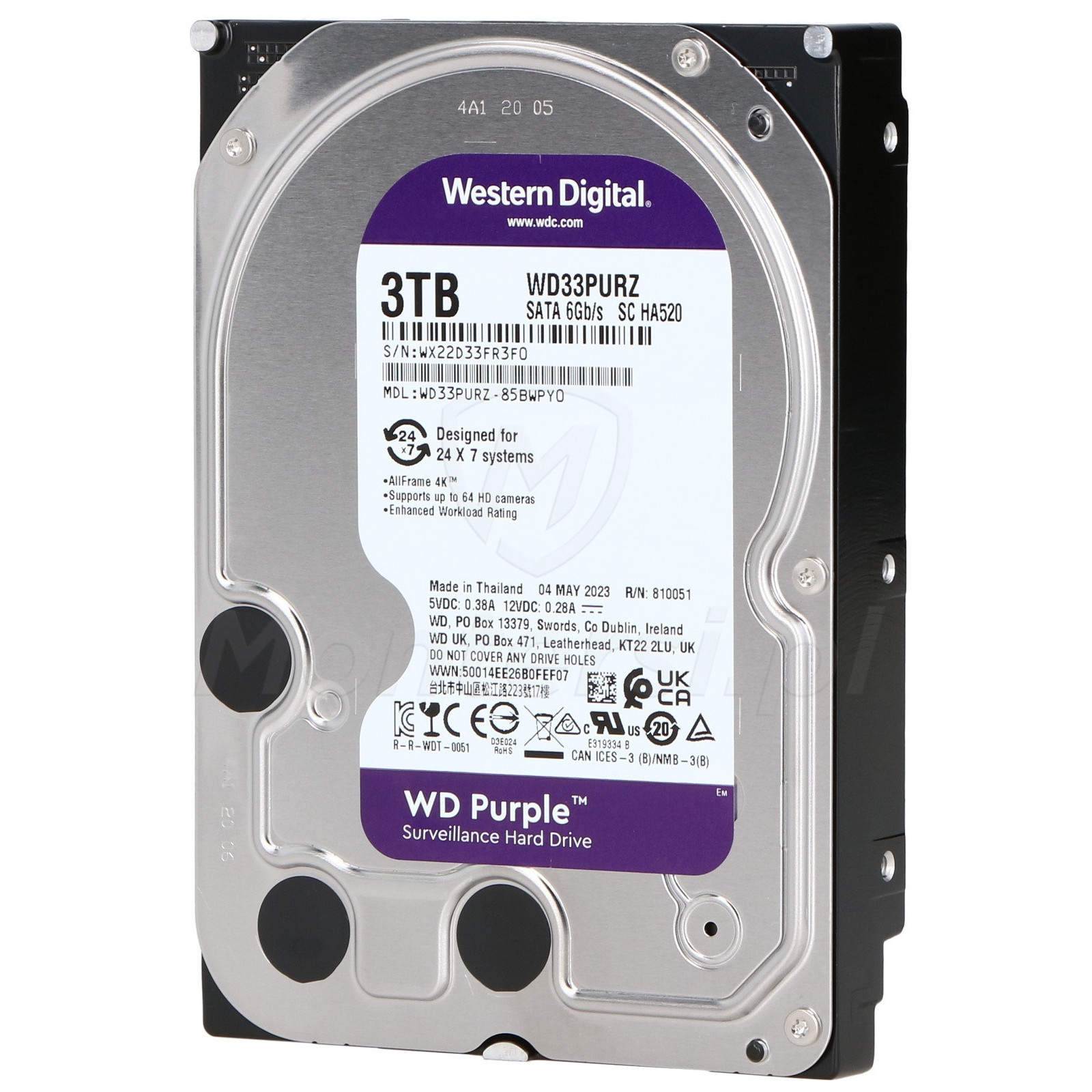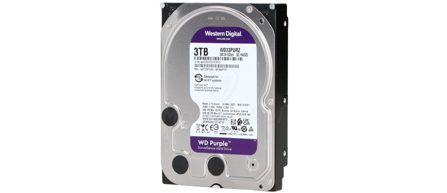 Dysk twardy Surveillance 3 TB, zaliczany do serii WD Purple. Cechuje się niezawodnością, trwałością i stabilnymi parametrami, podczas pracy ciągłej (24 godziny / 7 dni w tygodniu). Jest on więc doskonałym wyborem do realizacji systemu monitoring CCTV.