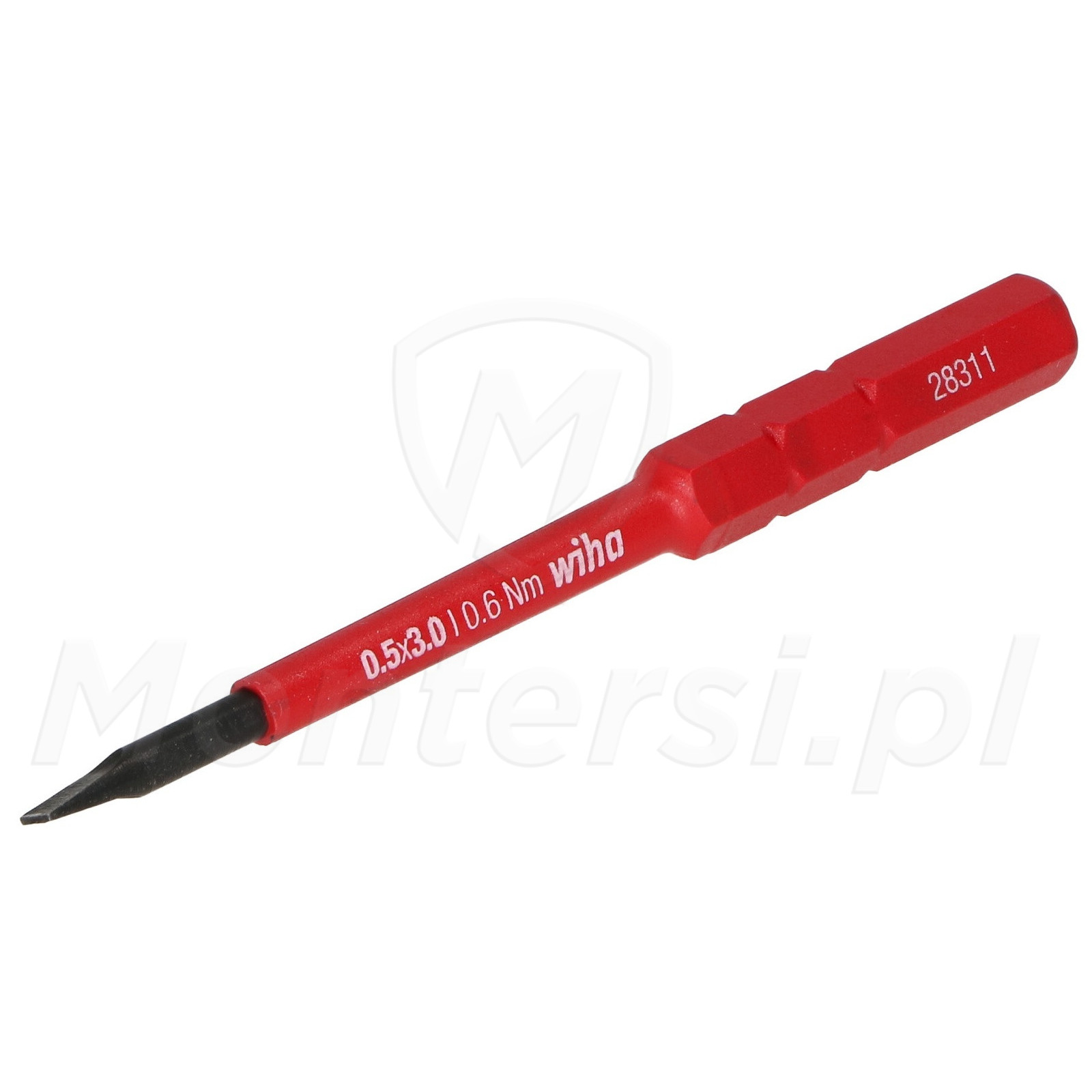 WIHA 34579 - płaski bit typu slimBit electric 75 x 3.0 mm zapewniający dobry i zabezpieczony dostęp do głęboko położonych śrub. Bit wykonany w technologii slim TECHNOLOGY odznacza się mniejszą w stosunku do tradycyjnych bitów grubością. Dzięki izolacji nadaje się do pracy w obszarze pod napięciem do 1000 V AC.