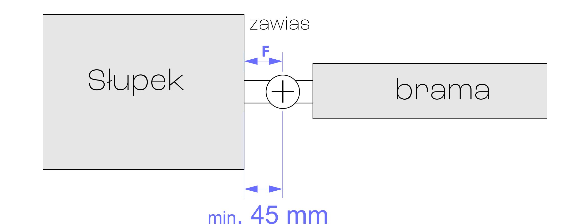 Zalecamy aby wymiar F wynosił minimum 45mm (Przy montażu na słupku 80x80mm), aby spełnić prawidłowe wymiary montażowe siłownika. Przed zakupem upewnij się, że instalacja spełnia ten parametr.