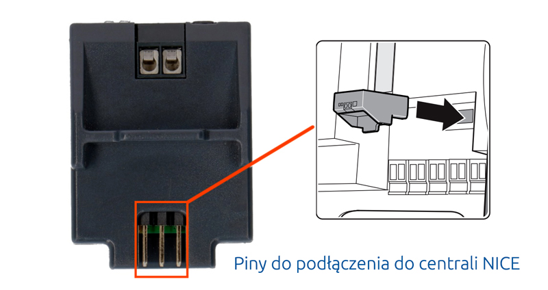 Na Frontowej części znajdują się: przycisk programowania, terminal do podłączenia opcjonalnej anteny oraz dwie diody LED. Zielona dioda T4, oraz niebieska ZW. Od spodu umieszczone są piny łączące moduł z centralą Nice. Na bocznej części obudowy znajdziemy naklejkę z danymi technicznymi, Kodem Pin oraz kodem DSK w wersji QR. Jego odpowiedni w wersji liczbowej, znajduje się na opakowaniu urządzenia.