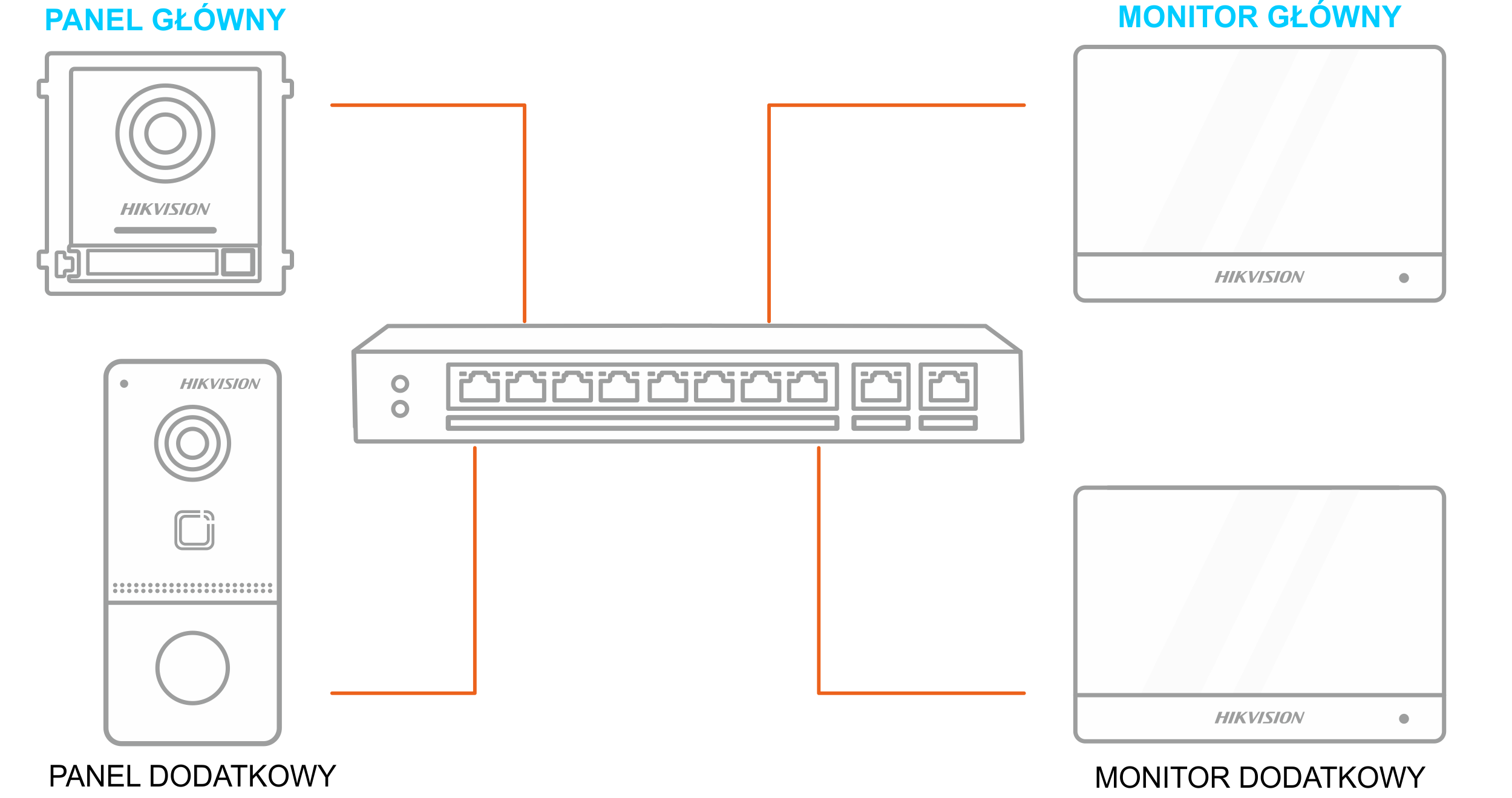 System jednorodzinny to taki, który posiada tylko jeden numer mieszkania. Oznacza to, że użycie przycisku wywołania na dowolnym panelu bramowym skutkuje dzwonieniem do wszystkich monitorów w obrębie danego mieszkania. Przy takiej strukturze wykorzystuje się panele bramowe z jednym przyciskiem, ponieważ numer mieszkania przypisany jest właśnie do niego. System zbudowany jest z przynajmniej jednego panelu bramowego oraz jednego monitora. Są to tak zwane urządzenia główne. Możliwa jest rozbudowa systemu o kolejne panele bramowe oraz monitory (Rys. 1). Każde kolejne urządzenie określone jest jako dodatkowe i synchronizuje swoje ustawienia z urządzeniem głównym (monitor dodatkowy łączy się z monitorem głównym, a panel dodatkowy z panelem głównym).