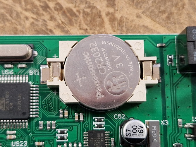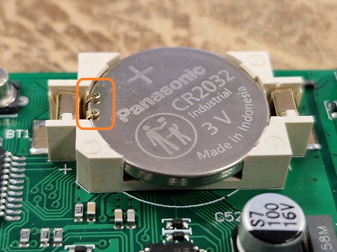 Na poniższym zdjęciu widać gniazdo, a w nim baterię CR2032 (centrala Integra 64).