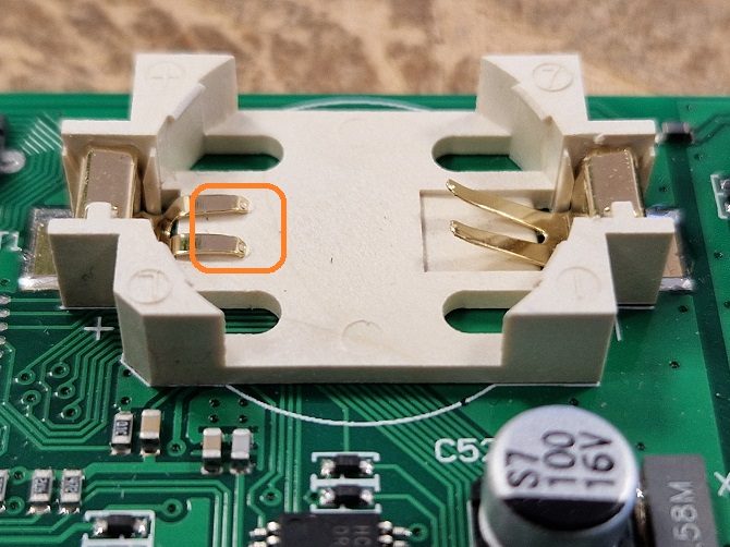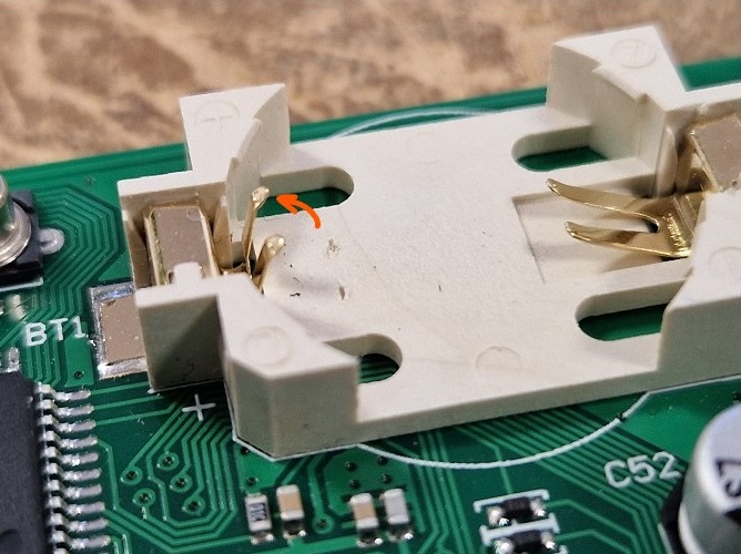 Poniżej widać puste gniazdo baterii, w którym po lewej stronie znajduje się blaszka – zgnieciona przez baterię. Ta blaszka powinna być ustawiona w pozycji pionowej, tak, aby dotykała rantu baterii, która jest na potencjale dodatnim (plus). Kiedy jednak blaszka jest położona, to dotyka tego samego potencjału (minus) co blaszka z prawej strony. Nie ma więc prawidłowego podłączenia baterii – urządzenie nie pracuje tak, jak powinno.