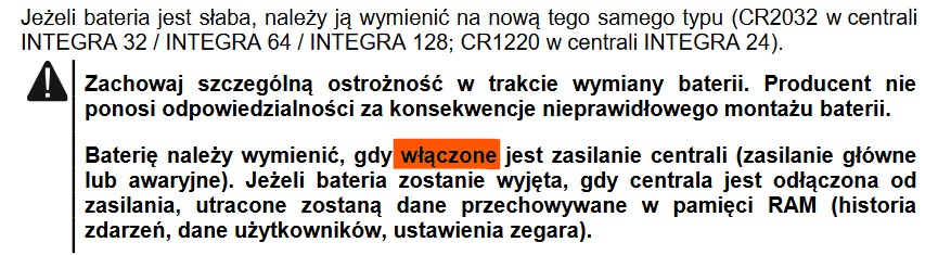 Dotyczy to wszystkich central Integra oraz Integra Plus. W centralach Integra 24 i Integra 128-WRL dostępna jest bateria litowa CR1220, a w pozostałych centralach Integra bateria CR2032.