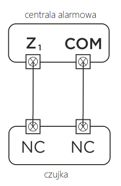 Schemat z lewej strony pokazuje podłączenie czujki w konfiguracji NC. Na pierwszy rzut oka nie widać tutaj żadnej nieprawidłowości. Taki schemat jest poprawny. Domyślnie, w stanie normalnym, styki alarmowe NC-NC są ze sobą zwarte. W konsekwencji płynie przez nie prąd i na wejściu Z1 centrali widoczna jest masa.
