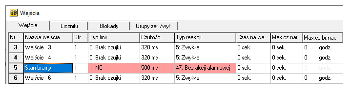 Typ „bez akcji alarmowej” gwarantuje, że wejście nigdy przypadkiem nie uruchomi akcji alarmowej (np. gdyby strefa czuwała).