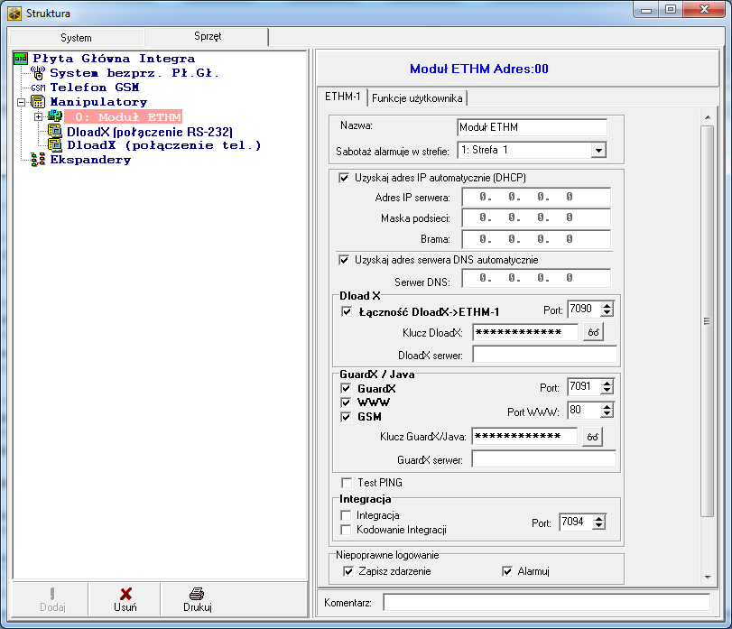 - Program do obsługi: Integra Control, GuardX