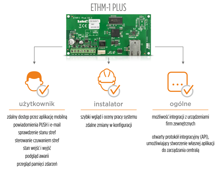 Moduł ETHM-1 Plus jest opcjonalny. Współpracuje z centralami INTEGRA oraz VERSA. Jednak w zależności od tego, z jaką centralą go połączymy, to docelowa funkcjonalność będzie się różnić (np. Versa nie ma możliwości integracji z systemem FIBARO przez moduł ETHM-1 Plus, a Integra ma taką możliwość). Wracając do pytania z tego akapitu – po co nam moduł ETHM? Możliwości jakie dostajemy podzielmy na 3 kategorie: dla użytkownika, dla instalatora i ogólne.