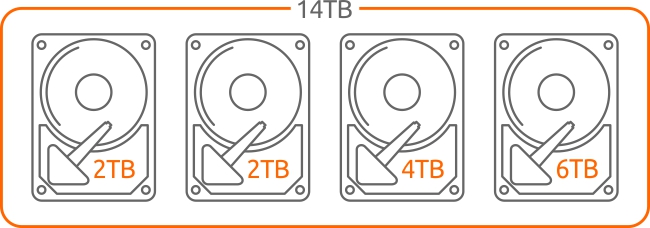 Przy zastosowaniu w/w dysków twardych sumaryczna pojemność będzie wynosić 14TB (2TB + 2TB + 4TB + 6TB).