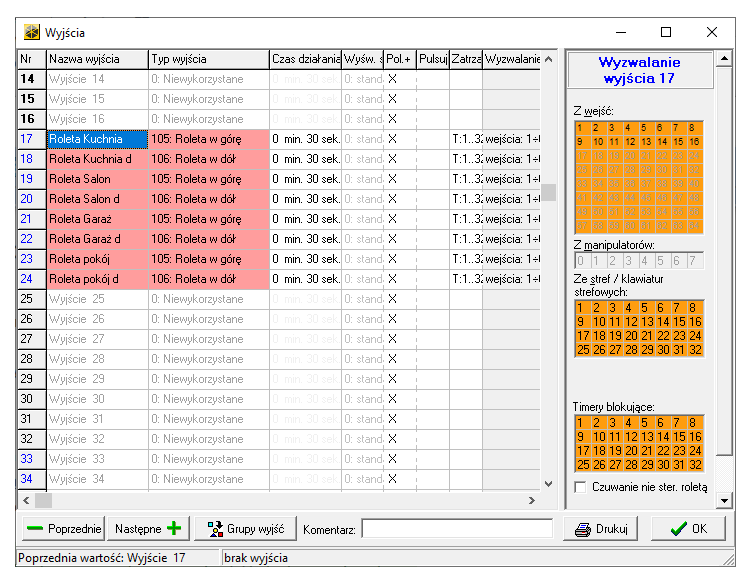 Każde wyjście roletowe (czyli typy 105 i 106) posiada zestaw opcji z prawej strony, które są „wyzwalaczami” tych wyjść. Domyślnie każda roleta ma zaznaczoną obsługę ze wszystkich 32 stref (tyle maksymalnie stref posiadają „duże” centrale serii Integra, czyli od Integry 64 i wyżej).