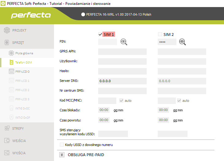 Na ten etap składa się przede wszystkim instalacja karty SIM w odpowiednim gnieździe, aktywacja tej karty w programie PERFECTA Soft oraz wpisanie kodu PIN dla karty SIM. Zrzut ekranowy pokazuje te ustawienia.