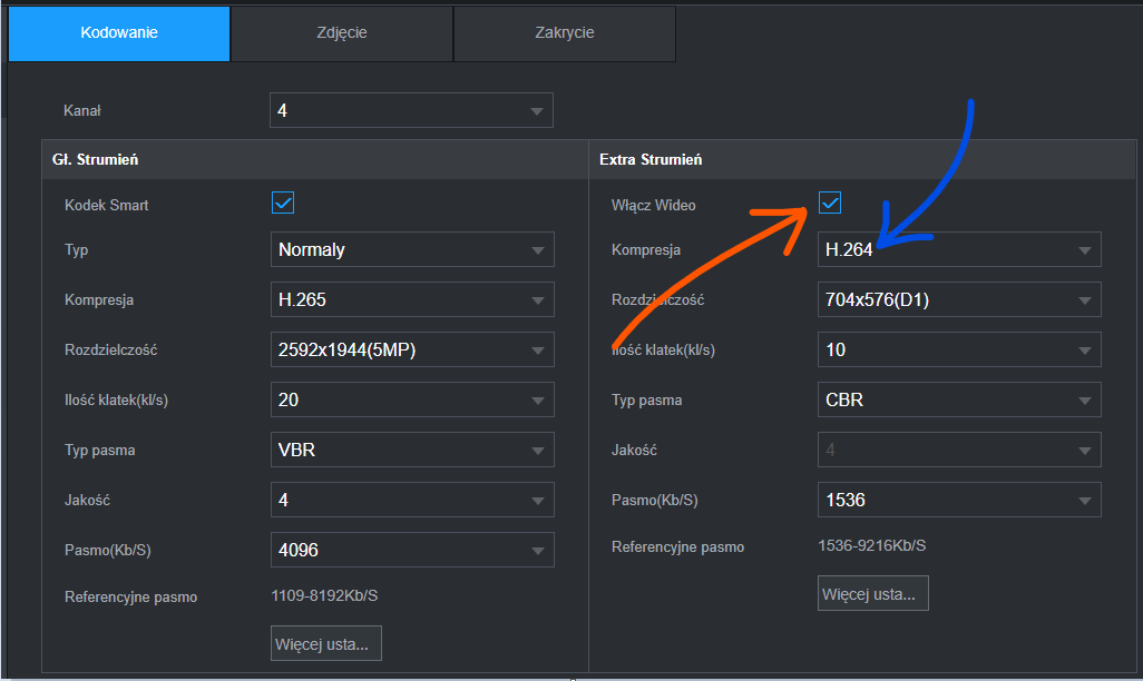 - Na głównym strumieniu najczęściej zostawiamy kodowanie H.265. To kodowanie sprawi, że nasz rejestrator zapisze 2x więcej materiału wideo. Jednak wspomniane kodowanie H.265 nie zostanie obsłużone przez INT-TSI – dlatego lepiej korzystać z dodatkowego strumienia, któremu ustawimy kodowanie H.264.