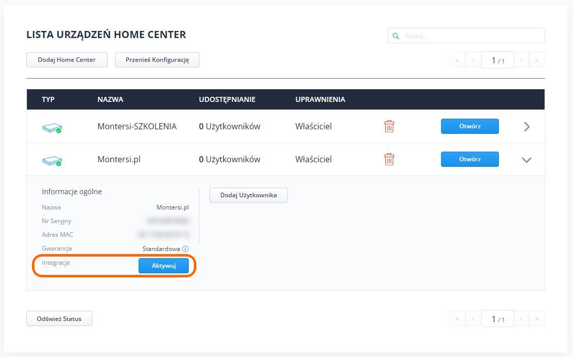 Za pomocą tego konta również realizowany jest dostęp zdalny do centrali, tak więc w większości przypadków konto jest już wcześniej utworzone. Taką integrację możemy wykonać tylko z jedną centralą podłączoną do konta Fibaro ID. Jeśli mamy kilka, to musimy zdecydować, która z nich ma mieć aktywną integrację. Możemy to zmienić, logując się do swojego konta Fibaro ID za pomocą przeglądarki Internetowej (Rys. 1).