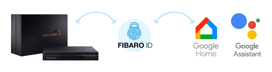 Integracja z asystentem głosowym to tzw. integracja zewnętrzna. Oznacza to, że komunikacja między usługami Google a centralą Home Center odbywa się za pośrednictwem konta Fibaro ID.