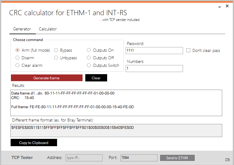 Powyższa aplikacja posiada wbudowanego klienta TCP, który umożliwia nadawanie ramek do systemu (program nie odbiera zwrotnie informacji od centrali). Po wygenerowaniu ramki, należy dodatkowo uzupełnić w programie adres IP modułu ETHM-1 oraz port integracji. Tak przygotowanym programem możemy testowo wysyłać ramki do centrali i sprawdzać działanie protokołu.