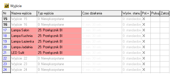 Wychodzimy od prostego wariantu, czyli takiego, w którym wszystkie nasze wyjścia od lamp są skonfigurowane jako przełączniki bistabilne (typ wyjścia o numerze 25: Przełącznik BI). Mając takie wyjście do dyspozycji, użytkownik może nim sterować np. z poziomu manipulatora LCD czy aplikacji mobilnej. Jeżeli włączy światło, to pozostaje ono włączone do momentu, w którym sam go nie wyłączy. Wychodząc z domu, musi pamiętać, aby wszystkie wyjścia „Przełącznik BI” wyłączyć. Docelowo będziemy chcieli to zautomatyzować.