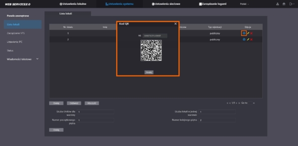 Aby wyświetlić kod QR przechodzimy do „Ustawienia Systemu”, następnie „Lista lokali” (Rys. 1). Na liście znajdują się wszystkie numery lokali, które obsługuje panel bramowy. Wybieramy interesujący nas lokal (numer) i klikamy w ikonę zębatki. Wyświetlony zostanie kod QR, który oprócz numeru seryjnego zawiera właśnie numer lokalu.