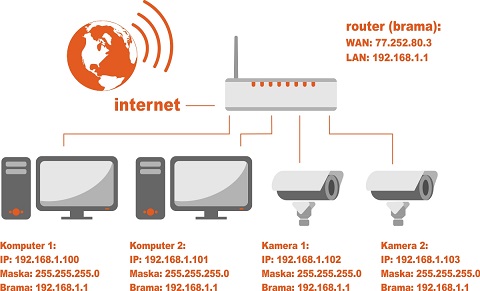 Cztery elementy sieciowe są wpięte do routera z wbudowanym switchem (przełącznikiem), a on sam jest podłączony do sieci internet. Operator dostarcza łącze internetowe z jednym adresem IP, który jest adresem publicznym – widzianym od strony internetu. Pamiętamy, że z punktu widzenia konfiguracji sieciowej, router nie interesuje się tym, jakie urządzenie (kamera/komputer itp.) jest do niego podłączone. Ważne jest tylko, aby dane urządzenie posiadało unikatowy, wewnętrzny adres IP (tym się zajmuje tzw. serwer DHCP, który jest mechanizmem wbudowanym w router), maskę oraz zdefiniowaną bramę.