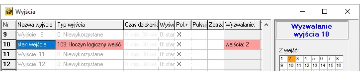 Iloczyn logiczny wejść (typ numer 109) to wyjście, które jest aktywne tak długo, jak długo aktywne są wszystkie jego zaznaczone wejścia. W powyższym przypadku (rys 2) zaznaczono tylko wejście nr 2, czyli naszą czujkę. Jeżeli więc wejście będzie naruszone, to wyjście również będzie naruszone. To taka „kopia” stanu wejścia.