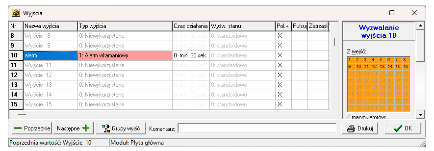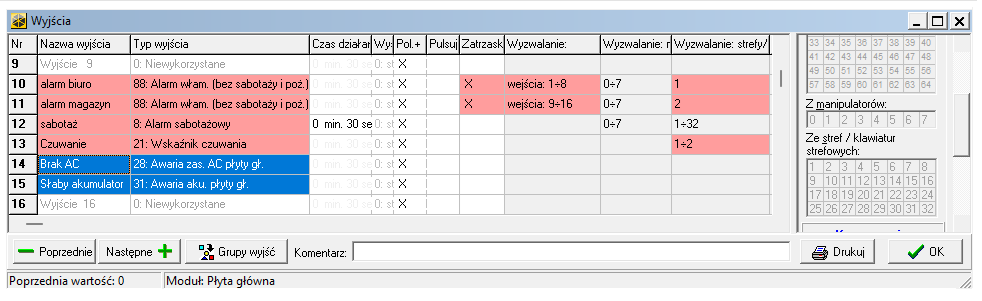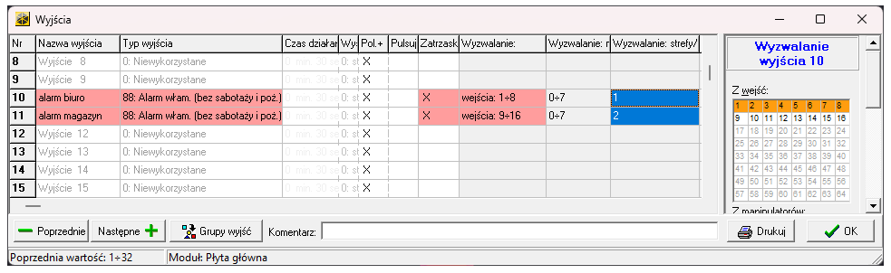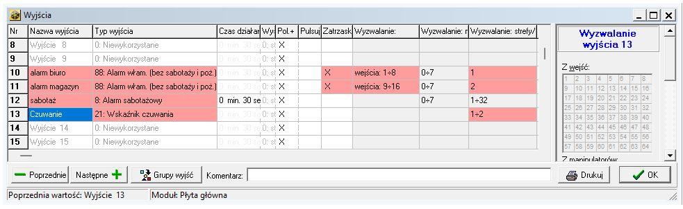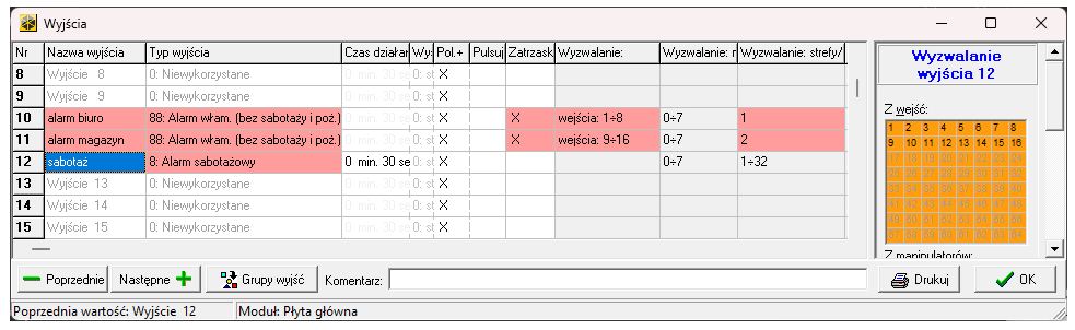 Tych sygnałów nie warto lekceważyć. Agencja ochrony powinna monitorować te stany systemu alarmowego, ponieważ są one krytyczne. W tym celu można konfigurować wyjścia jak na rysunku niżej: