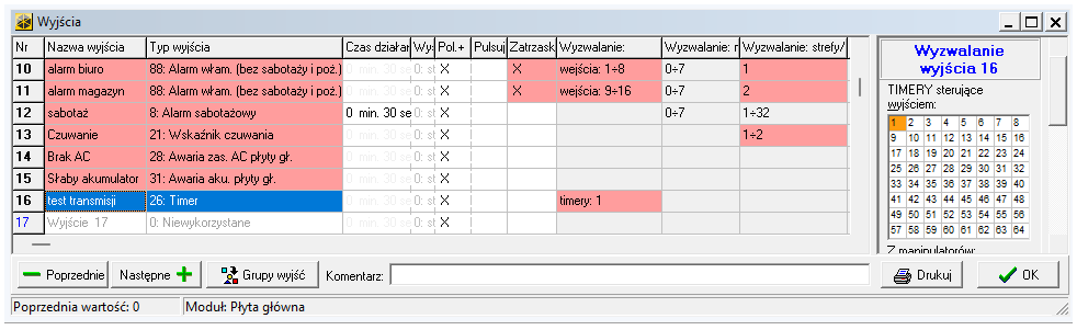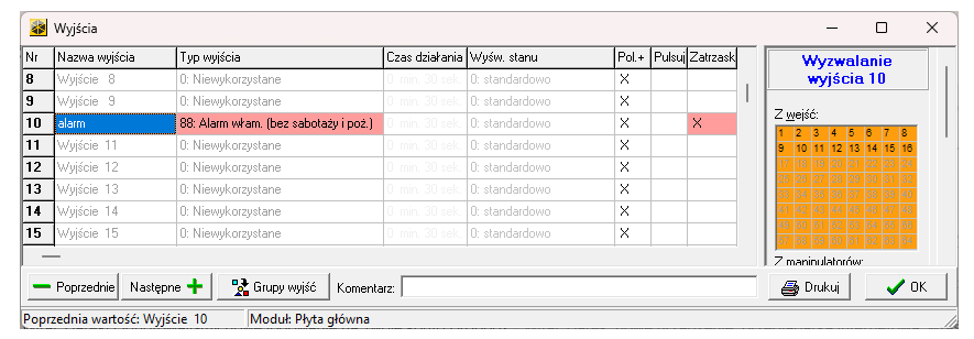 Dodatkowo, oprócz zmiany typu wyjścia na numer 88, została zaznaczona opcja „Zatrzask”. Warto zauważyć, że czas w kolumnie „Czas działania” przestał się wyświetlać. Teraz, jeżeli wyjście uruchomi się w momencie alarmu włamaniowego, będzie aktywne, dopóki uprawniony użytkownik nie skasuje alarmu.