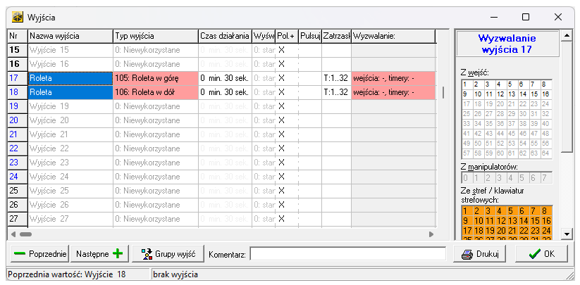 W centralach Integra korzystało się z dwóch typów wyjść: „Roleta w górę” oraz „Roleta w dół”. Poniżej zrzut ekranu: