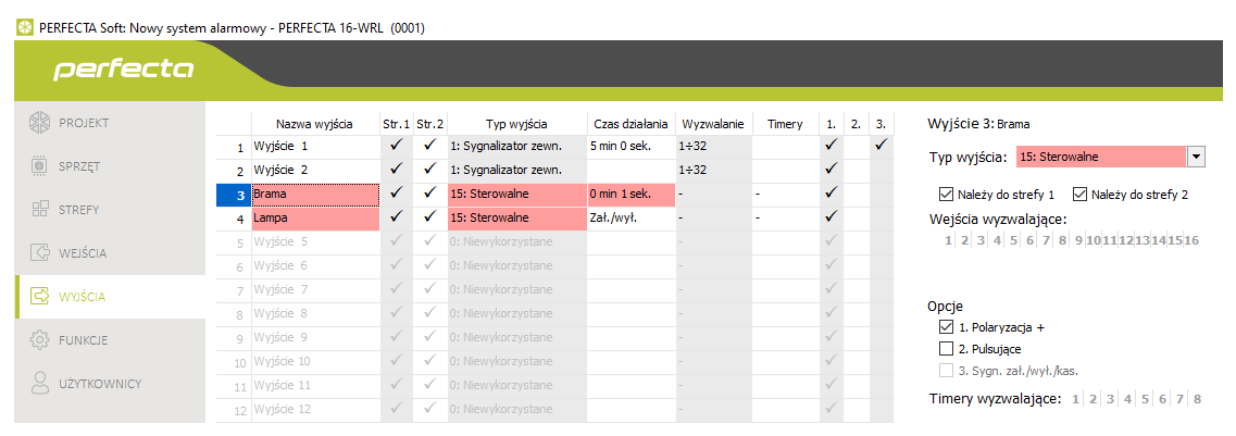 Sterowanie bramą, lampą, szlabanem itp. możliwe jest z centrali Perfecta, ponieważ posiada ona specjalny typ wyjścia: Sterowalne. Takim wyjściem możemy sterować na kilka sposobów: