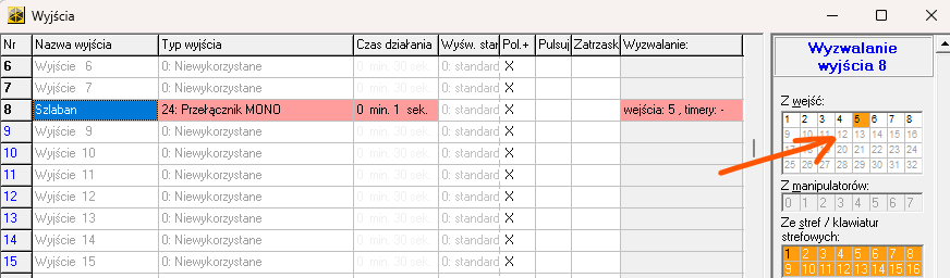 Jak rozumieć powyższy zrzut ekranu? Jeżeli moduł ethernetowy otrzyma ramkę (zostanie to rozwinięte niżej) zawierającą słowo „Szlaban”, to naruszy wejście nr 5, które jest składnikiem wyzwalającym wyjścia Przełącznik MONO: