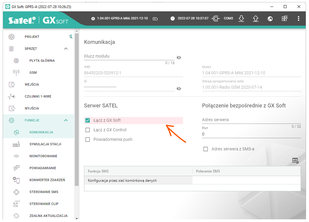 W zakładce [Funkcje -> Komunikacja] włączamy funkcję „Łącz z GX Soft”.