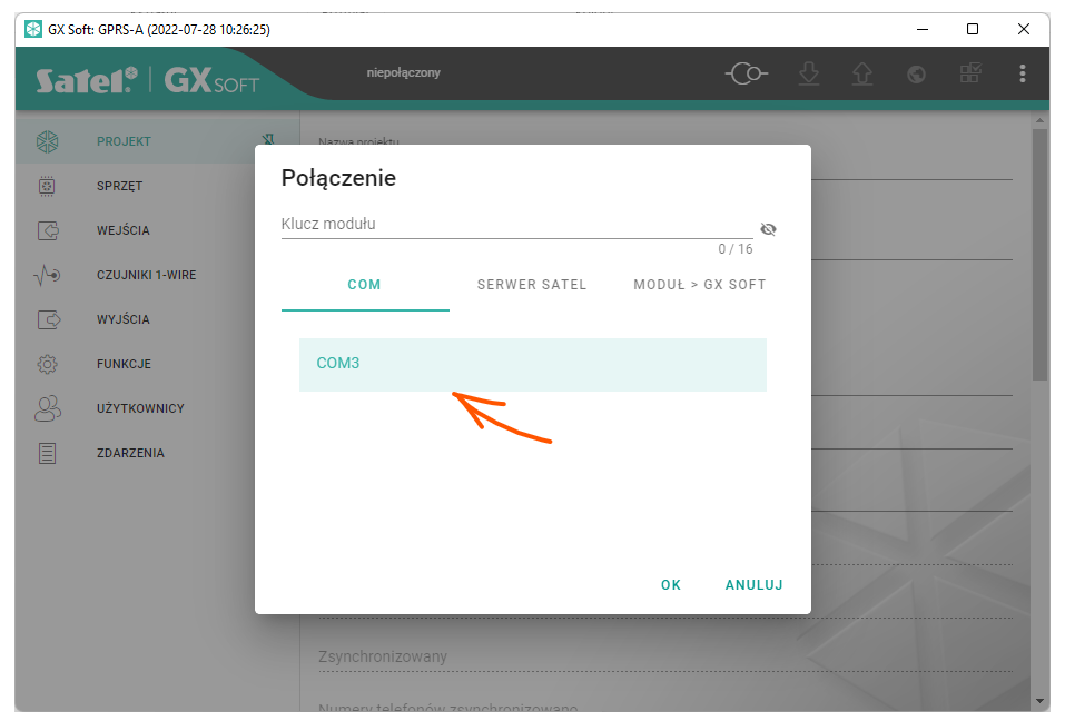 Krok 1: W programie GX Soft wybieramy moduł GPRS-A
