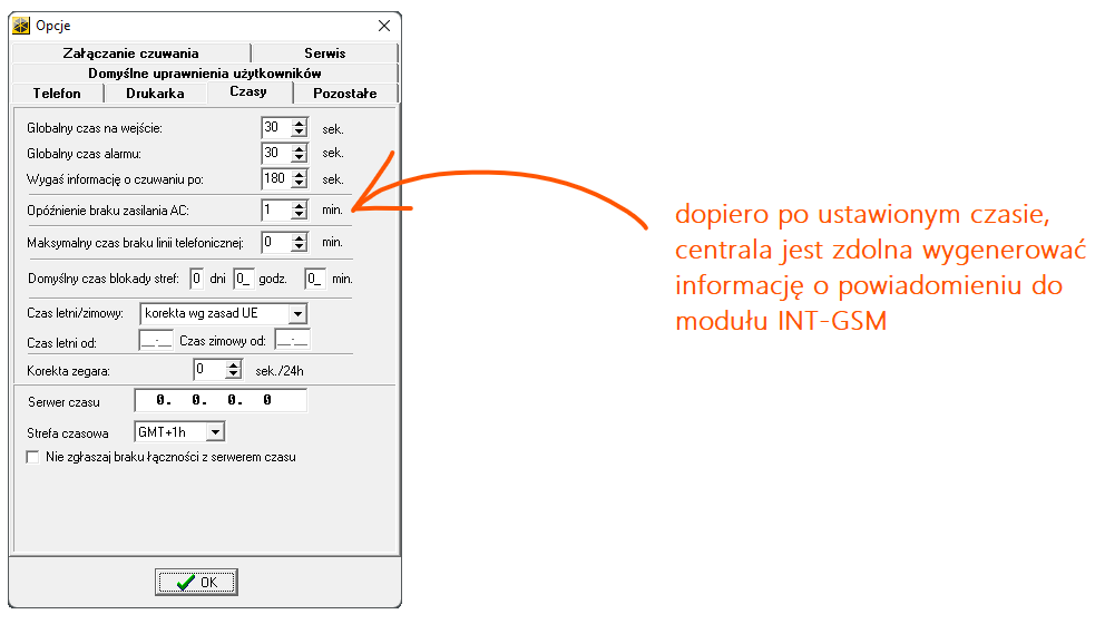 Co prawda, tekst nie wspomina nic na temat powiadamiania, mówi jedynie o pamięci zdarzeń, ale są to rzeczy ściśle powiązane. Należy pamiętać, że moduł INT-GSM jest zdolny wygenerować powiadomienie tylko wtedy, kiedy dane zdarzenie jest zapisywane w pamięci zdarzeń. Dlatego wpisanie wartości 0 (zero) nie wygeneruje powiadomienia, ponieważ informacja o braku zasilania nie trafi do pamięci zdarzeń (a więc nie będzie podstaw do tego, żeby ją dalej przetwarzać).