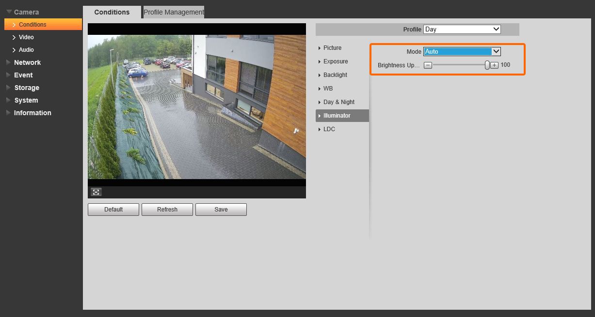 Oświetlacz włącza się automatycznie w trudnych warunkach oświetleniowych oraz dopasowuje swoją jasność do wymagań obserwowanej sceny. Dodatkowo istnieje możliwość określenia maksymalnej jasności, jaką może osiągnąć.