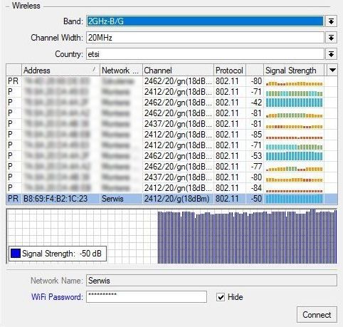 Wybieramy kraj, w którym użytkujemy urządzenie, następnie na liście dostępnych sieci bezprzewodowych wybieramy tą, z którą chcemy nawiązać połączenie. Wprowadzamy hasło dostępu do sieci i klikamy przycisk Connect. Mikrotik połączy się z siecią, a okno zmieni wygląd pokazując stan połączenia oraz jakość transmisji.
