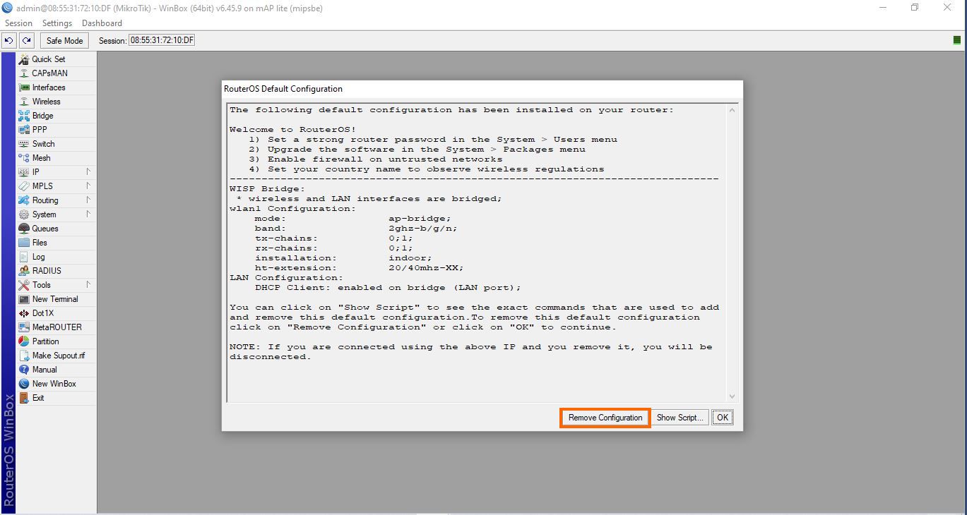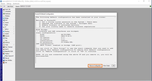 Usunięcie domyślnej konfiguracji powoduje skasowanie adresu IP (192.168.88.1), dlatego właśnie użyliśmy połączenia za pośrednictwem adresu MAC.