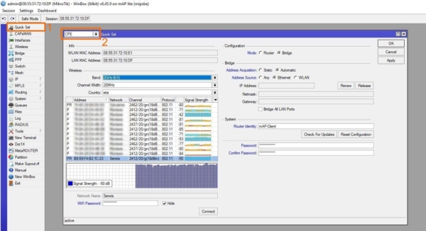 Teraz możemy przejść do właściwej konfiguracji mAP Lite. W prawej części programu dostępne są opcje konfiguracji. Będziemy korzystać z kreatora konfiguracji, czyli Qucik Set [1]. Po wybraniu tej opcji wyświetlone zostanie okno konfiguracji, gdzie wybieramy tryb pracy CPE [2]: