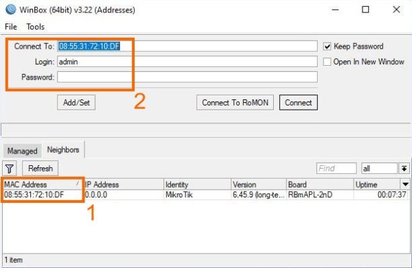 Połączenie z urządzeniem możemy wykonać na dwa sposoby. Pierwszy z nich to użycie domyślnego adresu IP urządzenia (192.168.88.1), drugi to połączenie za pomocą adresu MAC. Przy tej metodzie konfiguracji najlepszym rozwiązaniem jest połączenie za pomocą adresu MAC, ponieważ po wykonaniu konfiguracji adres IP może ulec zmianie, a my zostaniemy rozłączeni z urządzeniem.