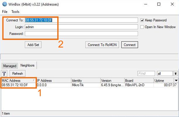 Podłączamy urządzenie do zasilania oraz do komputera. Uruchamiamy aplikację WinBox, następnie przechodzimy do zakładki „Neighbors”, gdzie aplikacja powinna wyszukać nasze urządzenie. Jeśli go nie widzimy to klikamy przycisk „Refresh” w celu odświeżenia listy urządzeń.