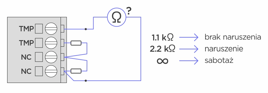 - Bez rezystorów: kiedy nie ma ruchu, styki NC-NC powinny być zwarte i powinny rozwierać się, kiedy czujka zobaczy ruch. Kiedy obudowa jest zamknięta (styk sabotażowy wciśnięty), to na stykach TMP-TMP powinno być zwarcie. Kiedy puścimy styk sabotażowy, na stykach TMP-TMP powinno być rozwarcie (przerwa).
