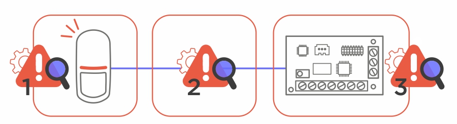 Kiedy już instalator ma na koncie „parę” powieszonych czujek, nabywa biegłości w zakresie szybkiej oceny tego, co mogło pójść nie tak. Już nie ma wtedy potrzeby rozbijać dużego problemu, ponieważ dysponuje wiedzą, co statystycznie jest do poprawy (np. źle dobrane rezystory, zdublowanie rezystorów własnych z tymi wbudowanymi w czujkę, pomylone zaciski w czujce). Jednak na początku przygody z alarmami warto rozbijać te problemy na mniejsze, ponieważ tylko w ten sposób można zbudować sobie konkretne fundamenty. A to ważne, by je mieć, szczególnie przy rozpatrywaniu trudniejszych przypadków.